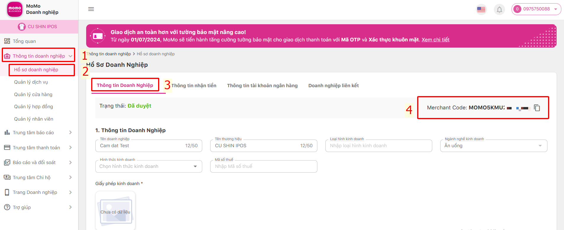 - Bước 4: Chọn vào “Thông tin doanh nghiệp” -> “Hồ sơ doanh nghiệp” để lấy MID.