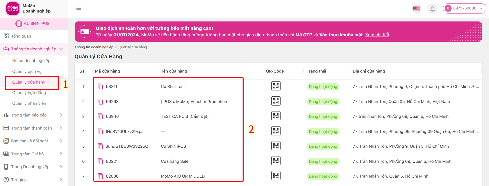 - Bước 5: Chọn vào “Quản lý cửa hàng” để lấy mã cửa hàng MoMo.