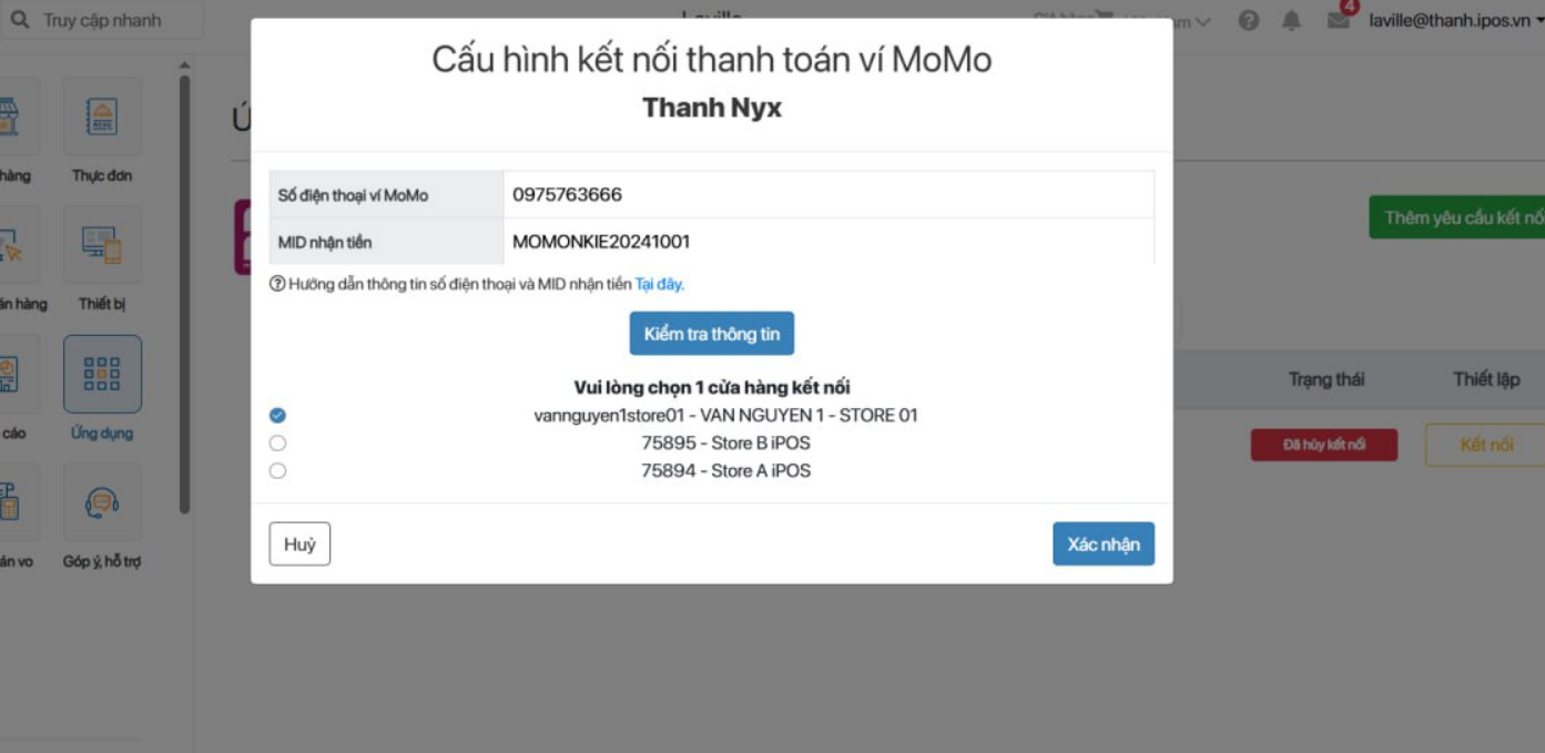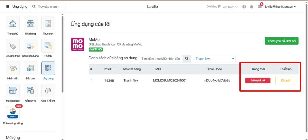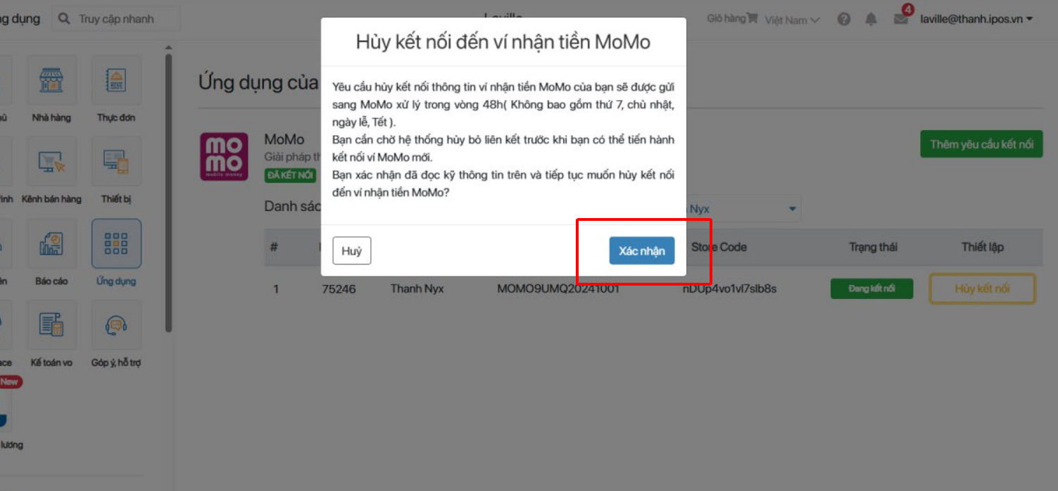 - Bước 3: Chọn cửa hàng cần thay đổi và bấm vào nút “hủy kết nối“.