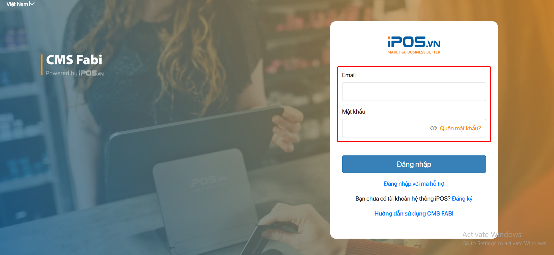 - Bước 1: Truy cập vào trang quản trị FABi http://fabi.ipos.vn và đăng nhập tài khoản.
