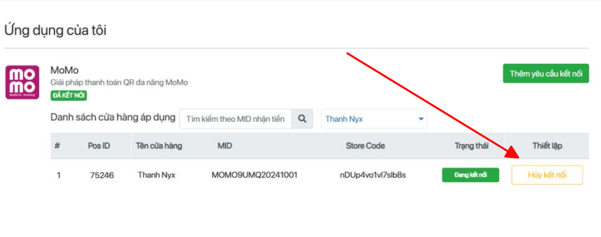 - Bước 3: Chọn cửa hàng cần thay đổi và bấm vào nút “hủy kết nối“.