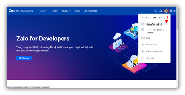 - Truy cập trang web https://developers.zalo.me/ à Chọn ứng dụng tương ứng (nếu chưa có ứng dụng app của OA thì tạo theo link sau https://developers.zalo.me/createapp )