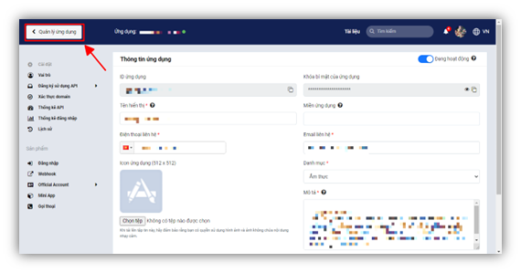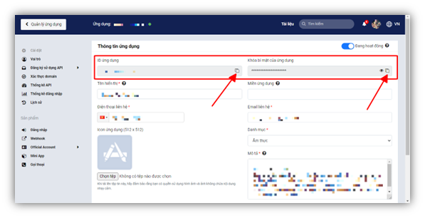 - Coppy 2 thông tin ID ứng dụng (APP ID) và Khóa bí mật của ứng dụng (App Secret) để paste vào thông tin cấu hình vào hình 1 bên trên