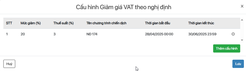 Cấu hình giảm giá thuế theo nghị định: khai báo chính sách giảm giá theo thông tư nghị định hiện hành: