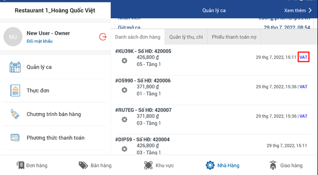 Hoặc có thể xem tại giao diện: Nhà hàng -> Xuất VAT