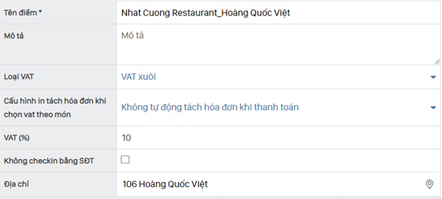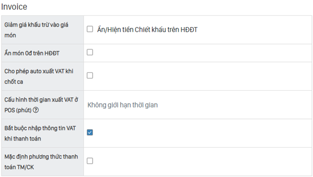 • Thao tác: Nhà hàng –> Danh sách điểm bán hàng –> chọn Nhà Hàng -> Mục “Invoice” tích chọn “Bắt buộc nhập thông tin VAT khi thanh toán”