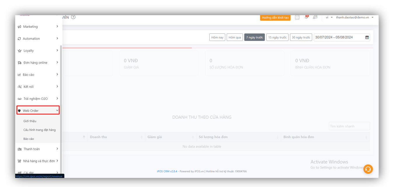 • Bước 3 : Chuyển sang trang web quản lý CRM vừa mở -> Chọn tính năng “Web Order”