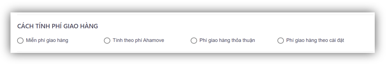 + Phí giao hàng theo cài đặt: nhà hàng sẽ tự cấu hình số tiền phí vận chuyển cho mỗi km.